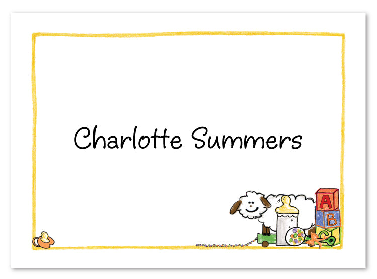 This folded note card features a lamb pull-toy, bottle, rattle, blocks and a pacifier....baby's favorite toys! Personalize this stationery with your little one's name!