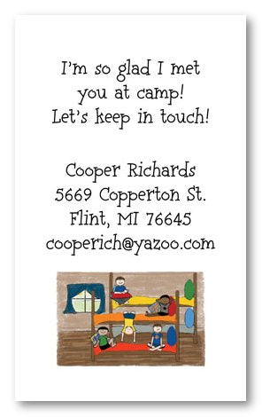 A bunch of boys sit on their bunk beds at camp on these calling cards. Send your boy off to camp with these cards to pass to all his new friends! Personalize with your own text!